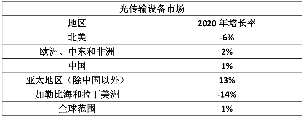 根據(jù)市場研究公司Dell'Oro Group發(fā)布的最 新報告顯示,全球光傳輸設(shè)備市場收入在2020年增長了1%,達(dá)到160億美元。在此期間,除了北美地區(qū)和拉丁美洲地區(qū)以外,其他所有地區(qū)都實現(xiàn)了增長。