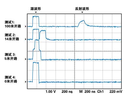 圖1 顯示不同電纜開路條件下的波形實例。 左側是源波形,右側是反射的波形 (在穿過電纜后的源波形的反射,在開路電纜的末端反射并折回)。在測試1 (100米開路電纜)中, 具有低通濾波器特性的5類電纜導致反射波形的濾波。