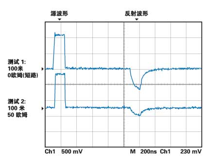 · 當負載阻抗為300歐姆時,反射系數為0.5,這意味著反射波形數是源波形的一半。電纜診斷技術使用反射波形的極性和數量來準確計算和報告負載阻抗。圖3 顯示短路 (0歐姆負載阻抗)和50歐姆負載阻抗的實例。